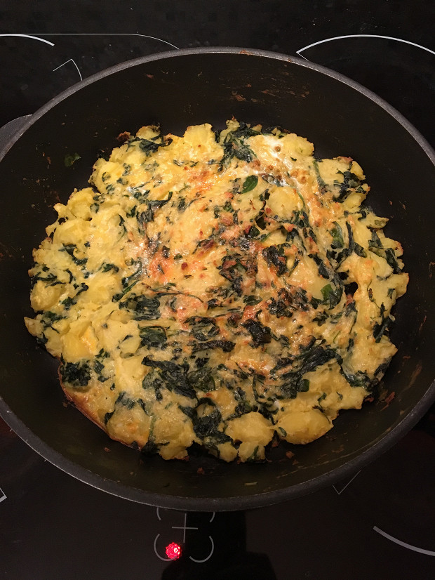 Простейший рецепт, в котором толченая картошка соединяется с тушеным шпинатом и сметаной. Шпинат можно брать как свежий, так и замороженный.