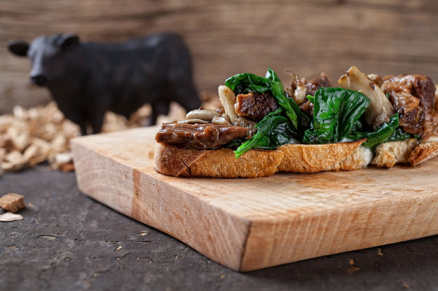 Бычий хвост варится пять часов на медленном огне, затем разбирается на волокна, смешивается с соусом бешамель и укладывается на чиабатту. Рецепт — из московского ресторана «Рыбы нет».
