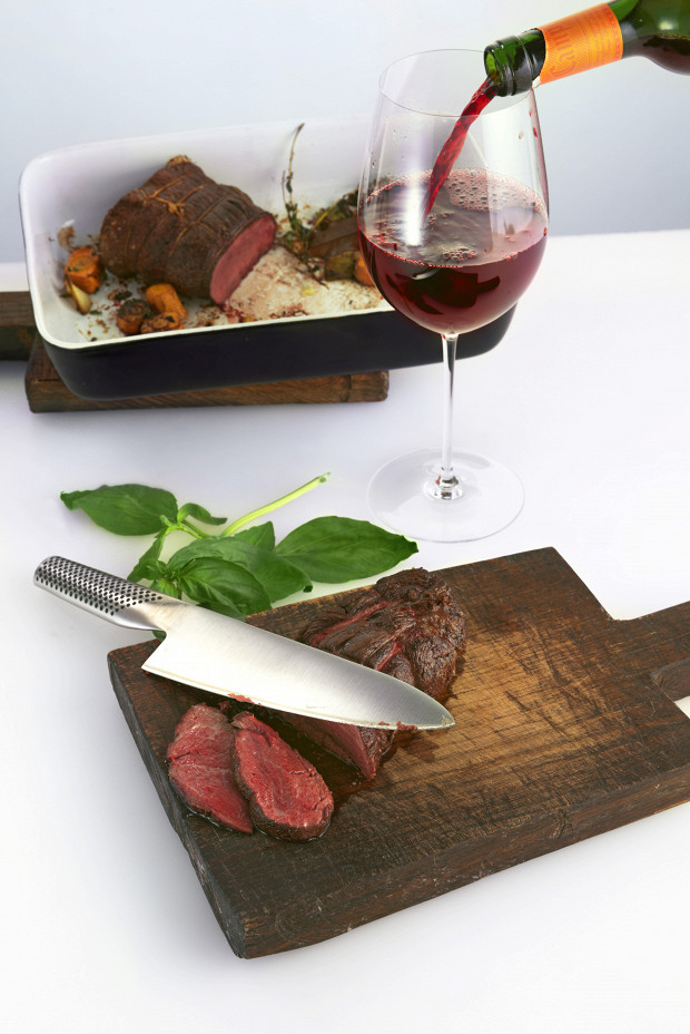 Говяжья вырезка перетягивается жгутом, отчего она становится похожа на колбаску. Мясо надо обжарить на сковородке до характерного коричневого цвета, а после вместе с овощами и тимьяном отправить в духовку.