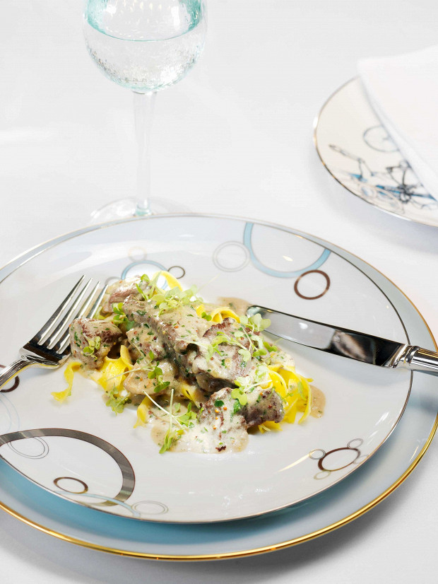 Говяжья печень бланшируется в масле, затем томится в сливках, а после смешивается с тушенными в коньяке морковью и сельдереем — и сливочным маслом.