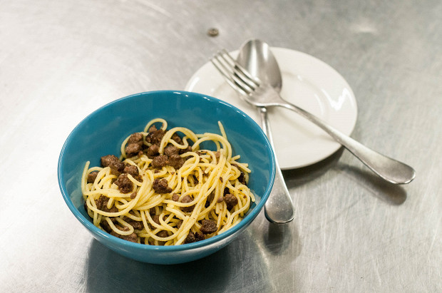 Блюдо, знакомое с детства, — но в этом случае фарш после обжарки недолго тушится в белом вине. Рецепт у нас — из греческого ресторана Molon Lave, но в меню там макарон по-флотски нет, их едят сами повара.