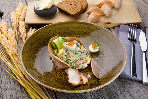 Рецепт, которым с нами поделилась шеф московского ресторана «Шинок» Елена Николаевна Никифорова. Вместо мяса — говяжий язык, картошку не варить, а запекать с чесноком, майонез смешать со сметаной, а в качестве украшения — красная икра.