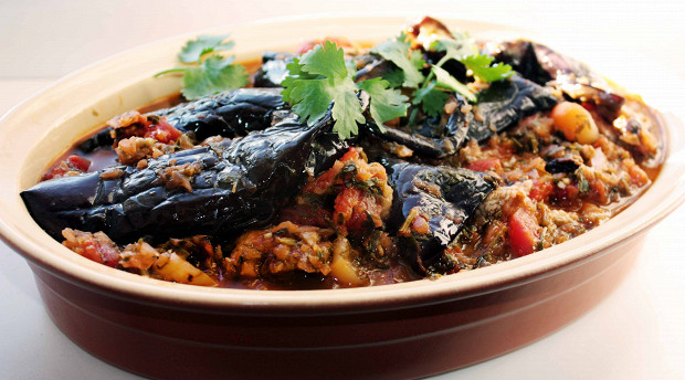 Замечательный овощной набор: перцы, помидоры, лук и зелень тушатся вместе, а после соединяются с жареными баклажанами. Перед тем, как подавать на стол, блюдо хорошо подержать несколько часов в холодильнике.