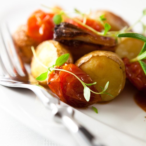 Простейший итальянский гарнир — картошка запекается в оливковом масле, с чесноком, травами и помидорами. Если увеличить порцию, то вполне сгодится как основное блюдо на обед. Вместо базилика можно взять орегано.