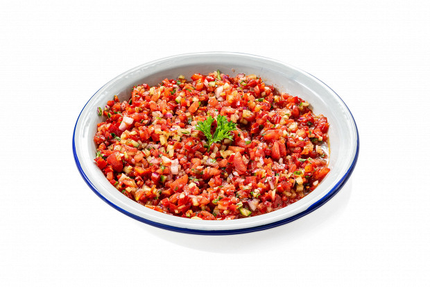 В переводе с турецкого название этой закуски означает что-то вроде «острое, протертое» или «острое, толченое». Это и есть вкратце технология ее приготовления: аджилы-эзме может выглядеть как паста, пропущенная через мясорубку или растертая до абсолютно гладкого состояния, а может как аджика или сальса, то есть нарезанная мелкими кубиками, величиной с рисовое зернышко. Мы приготовили в редакции второй вариант: нам он показался более тактильным. Аджилы-эзме — один из вариантов мезе, типично восточной подачи, когда микрозакусками покрывают весь стол, рядом ставят горячие лепешки, а дальше каждый выбирает, как ему больше нравится: можно намазывать мезе на хлеб, можно есть ложкой, а можно макать хлеб в миску. Основу закуски составляют помидоры и перец, дальше остроту и пряность каждый регулирует под свой вкус при помощи чили-перца, лимонного сока и зелени.