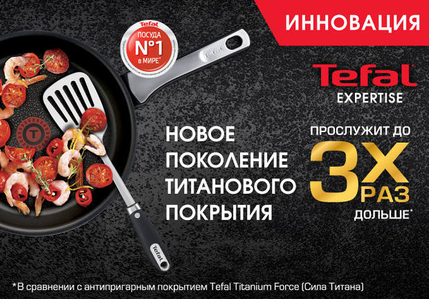 Среди современных покрытий такого рода — самое популярное, пожалуй, титановое. Оно многослойное, и в нем есть не только титан, который наносится несколько раз с помощью плазменного напыления. Применение этого легкого и прочного металла увеличивает срок службы сковородок в несколько раз. Сковороды из коллекции Tefal Expertise, например, имеют многослойное титановое покрытие нового поколения — предельно твердое и устойчивое к царапинам. Можно сказать, что оно объединяет в себе лучшие антипригарные свойства с неуязвимостью титана. Называется покрытие Titanium Excellence, и ему не страшны ни металлические лопатки, ни интенсивный режим посудомоечной машины, ни абразивные губки и даже разрушительные температурные воздействия. И даже при интенсивном использовании сковороды Tefal Expertise прослужат в три раза дольше посуды с обычным антипригарным покрытием.