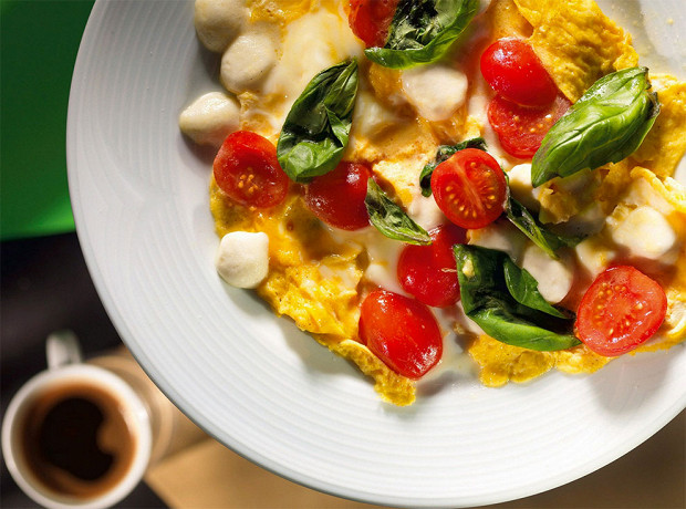 Это яичная версия знаменитого салата капрезе и неаполитанской пиццы. Помидоры, моцарелла и зеленый базилик здесь обязательно должны быть хорошего качества. Яйца для этого омлета, как и для большинства других плоских омлетов, надо смешивать вилкой, а не взбивать в пену венчиком. После смешивания получается более точная, тягучая и неоднородная текстура. Сливочное масло можно заменить оливковым.