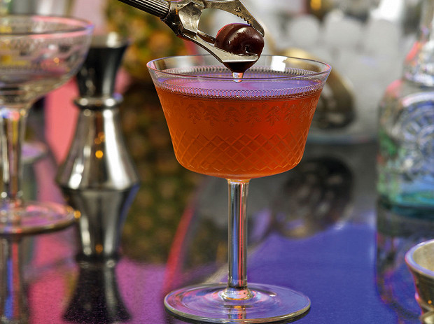 Классика в чистом виде: бурбон, вермут, ангостура, вишня — и ничего лишнего. Для украшения вместо засахаренной коктейльной лучше использовать свежую вишню, пропитанную алкоголем, — она куда вкуснее.