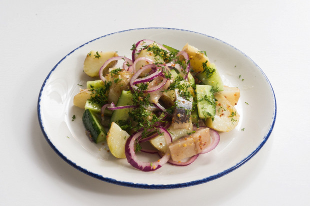 Обычно картофельные салаты — тяжелые, сытные, их готовят зимой. Но молодая картошка ставит все с ног на голову: она вкусна сама по себе, а в тесном соседстве с малосольной селедкой ее вкус переходит в мощное крещендо. Чтобы клубни остались плотными и не развалились, варить их лучше целиком, не снимая «мундира» (он, кстати, у молодой картошки вполне съедобен) и подавать, пока картофель еще теплый. За лето в этом салате отвечают свежие огурцы и укроп, которые можно рвать прямо с грядки, а медово-горчичная заправка идет всем салатам с участием картошки без исключения, добавляйте в любой — не ошибетесь.