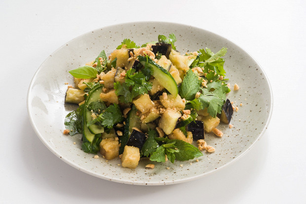 Азиатский салат с хрустящими баклажанами, кинзой и арахисом