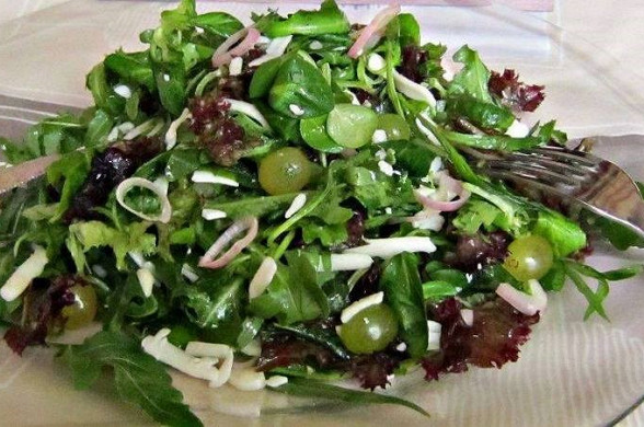 Зеленый салат с виноградом и пармезаном — необычное сочетание свежести кинзы, сладости винограда и легкости салатных листьев. Рецепт Аниты.