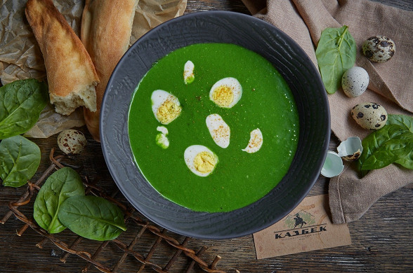 Шечаманди из шпината, витаминный суп. Легкий в приготовлении, яркий и ароматный. Рецепт шефа ресторана «Казбек» Мамии Джоджуа.