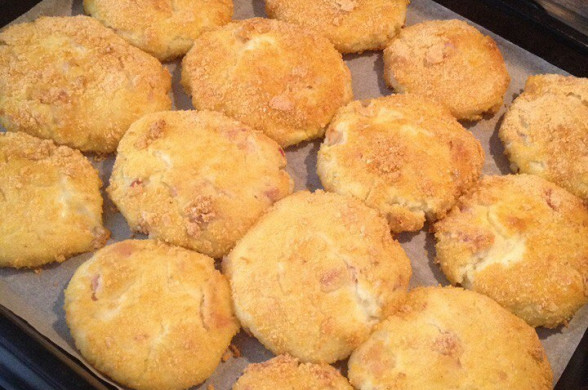 Картофельные котлеты с беконом и сыром моцарелла в кукурузных панировочных сухарях. К ним хороша охлажденная густая сметана. За рецепт спасибо Маргарите.