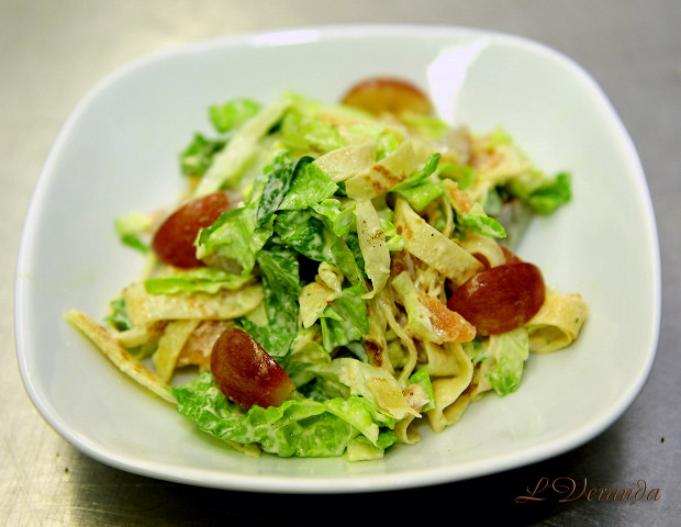 В новой пятерке — овощной салат по‑грузински с грецким орехом, итальянский салат с русским блинчиком, кускус с песто, спагетти с креветками и черемшой, миндальные конфеты с вишней.