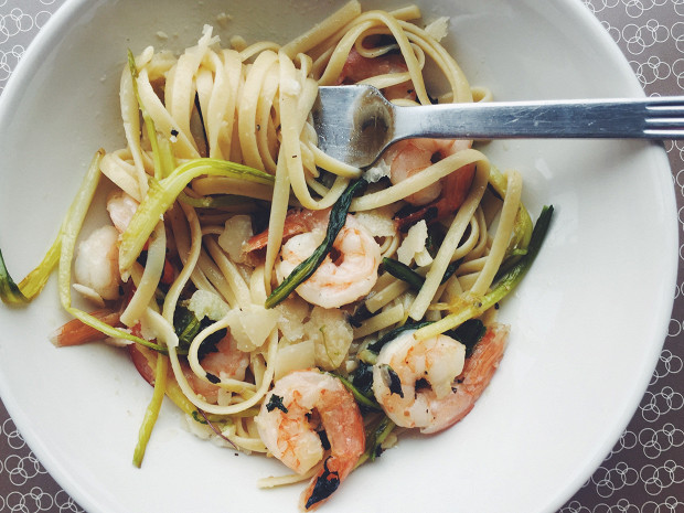 У Анны Бурнашевой есть несколько хороших рецептов лазаньи (рекомендуем) — а недавно она поделилась рецептом пасты, в которой черемша встречается с креветками.