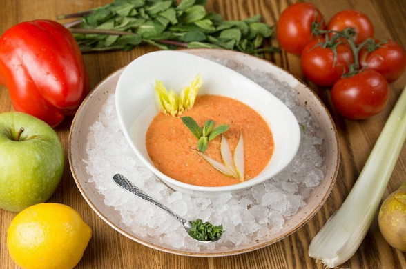 Шеф ресторана «Тарантино» Виктор Апасьев и его рецепт весеннего овощного коктейля, если поместить его в бокал, или супа — если налить его в тарелку.