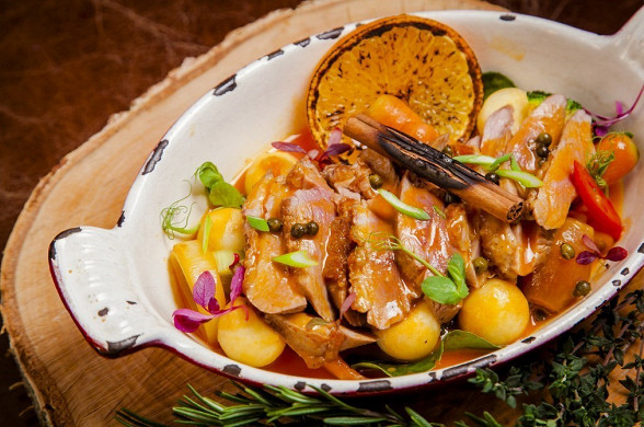 Острая утиная грудка под соево-ореховым соусом гамадари и с гарниром из овощей. Спасибо за рецепт шефу ресторана «Кристиан» Кристиану Лоренцини.