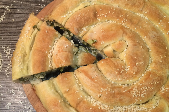 Оригинальный пирог из слоеного теста с сырной начинкой и зеленью, закрученный спиралью. «Спанакопита — это традиционный греческий пирог со шпинатом и сыром. Рецепт Анны Болдыревой.
