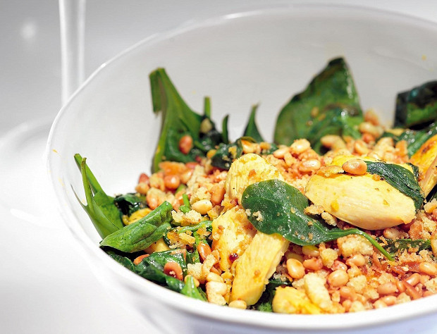 При обжаривании шпинат теряет объем, так что четыре порции салата при подаче уместятся и в небольшой миске.
