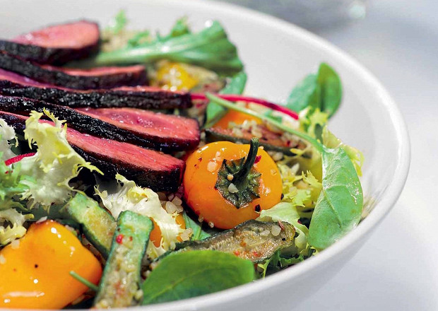 Ломтики мяса в салате выглядят тем эффектнее, чем темнее получится корочка при минимальной степени прожарки.