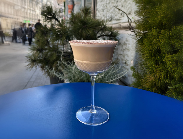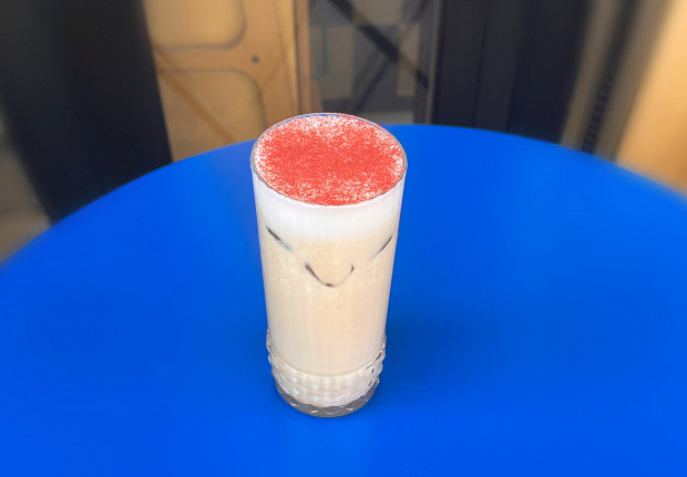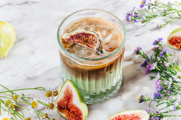 Красивый и сложносочиненный рецепт, который нам достался из ресторана «Скворец», что на Малой Бронной. Помимо эспрессо и молока, тут есть еще инжир, шпинат и инжирный джем, усиливающий фруктовую кисло-сладкую ноту.
