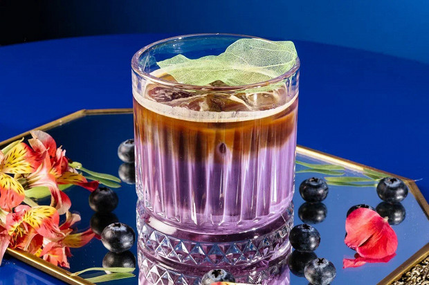 Еще один рецепт из «Скворца», самый простой, будто родом из детства: эспрессо, молоко и черничное варенье.
