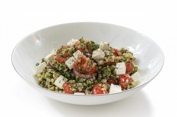 Гречка с помидорами, песто и фетой