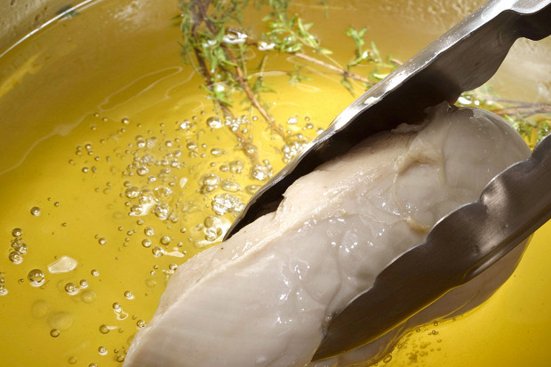 Конфи — самый, пожалуй, гурманский способ, старинная французская техника приготовления, когда мясо или птица медленно томятся в жире. В результате получается не просто полезная еда, а настоящий деликатес. Чтобы приготовить грудку-конфи, я рекомендую вам ее сначала замариновать, например с тимьяном, чесноком, солью и перцем, минут на 20. Тем временем разогрейте в толстом сотейнике утиный жир (если утиным жиром вы не запаслись — подойдет хорошее оливковое масло первого отжима), поставив его в духовку, разогретую до 64–65 градусов. Жира или масла понадобится столько, чтобы они покрывали грудку целиком. Опустите в жир маринованную грудку (можно вместе со всеми специями из маринада) и томите при той же температуре в течение двух часов. Не думайте, что в куриную грудку за это время проникнет тонна жира, — жир или масло будут лишь мягко ее обволакивать, не давая утратиться нежности. При подаче грудку можно будет обсушить бумажными полотенцами, и она ничуть не потеряет своей легкости. Но если диета — не ваша забота, то тем же способом можно приготовить и куриные бедра, получится жирнее, но еще нежнее».