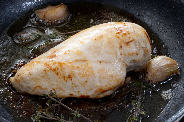 Идеального результата можно добиться и при обычной жарке, главное — четко следить за таймингом. Я делаю следующим образом: куриную грудку солю, перчу и обжариваю на хорошо разогретой сковороде на смеси растительного и сливочного масла с добавлением тимьяна и чеснока примерно по одной минуте с каждой стороны. Затем убираю грудку в разогретую до 180 градусов духовку на 7 минут. Лучшая посуда для приготовления нежной грудки — сковорода с толстым дном, равномерно распределяющим тепло. Если у этой сковороды еще и тефлоновое покрытие — то грудку можно готовить вовсе без масла.