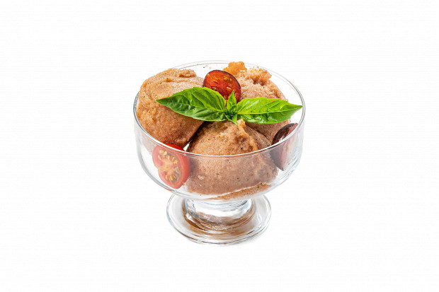Несладкое мороженое отнюдь не оксюморон. Оно вовсю используется поварами как контрастное дополнение к супам или как завершающий штрих к сложным закускам. Но и без всякой компании томатный сорбет хорош в жару, в нем нет сахара, а только уксус и ароматные травы, и если после сладкого сорбета всегда мучительно хочется пить, то после этого сорбета хочется только сорбета. Подать его можно в обычной креманке, а по какому-нибудь торжественному поводу упаковать все в те же помидоры, предварительно выскребав мякоть и пустив ее в сорбетную гущу.
