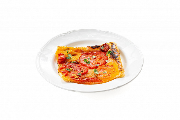 Знаменитый пирог сестричек Татен, которые, как гласит легенда, готовили обыкновенный тарт, уронили на пол и перевернули с ног на голову, давно перерос границы определенного рецепта, превратившись в целый кулинарный жанр. С чем его только не готовят, от баклажанов до бараньих мозгов, но с помидорами он точно получается интереснее, чем с яблоками. Они имеют во вкусе характерную кислинку и красиво карамелизуются на сковороде с красным луком и бальзамическим уксусом, превращаясь почти что в мармелад. К тому же такой тарт-перевертыш можно подать и на закуску, и на десерт, если убрать из рецепта чеснок и заменить его щепоткой ванили и тростникового сахара.