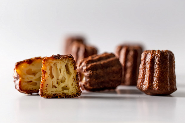 По форме канеле — это кекс, по текстуре — пористый бисквит, а если сделать на верхушке дырочку и залить туда шоколад или соленую карамель, то получится пирожное. По самой красивой версии канеле обязаны своим появлением производству бордоских вин: в XVII–XVIII веках для осветления вина использовали большое количество взбитых яичных белков, а желтки оставались не у дел. Вероятно, рецепт канеле стал результатом попыток применить их с пользой. На канеле сегодня в московских кондитерских мода, но часто это канеле только по форме, а по вкусу какая-то непропеченная мокрая ерунда. Хорошее канеле легко отличить от плохого: у него должна быть темная хрустящая карамельная корочка и чуточку влажный, но легкий и пористый мякиш с тонким ароматом ванили и рома. И если постучать боком пирожного о тарелку, эта корочка должна еще и тихонько звенеть. У нас рецепт канеле — проверенная веками классика из книги Стефана Глясье «Tartes et gâteaux de voyage, pâtisserie boulangère».