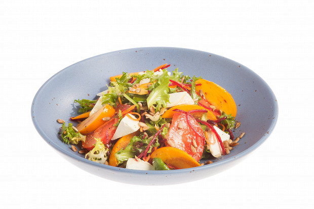 Салат с хурмой, свежими овощами и козьим сыром