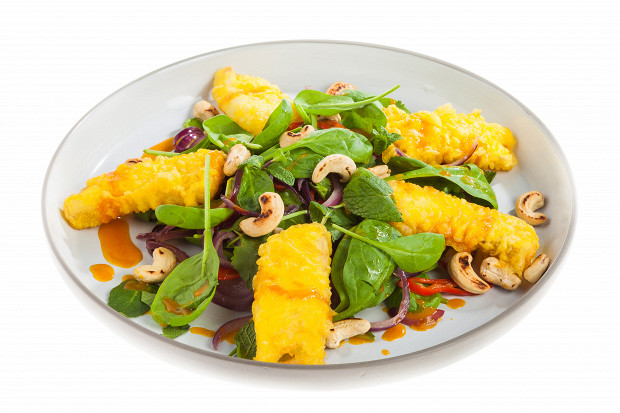 Треска в нарядном оранжевом кляре вступает здесь в пряный союз с облепиховым соусом, шпинатом, кешью и острым перцем.