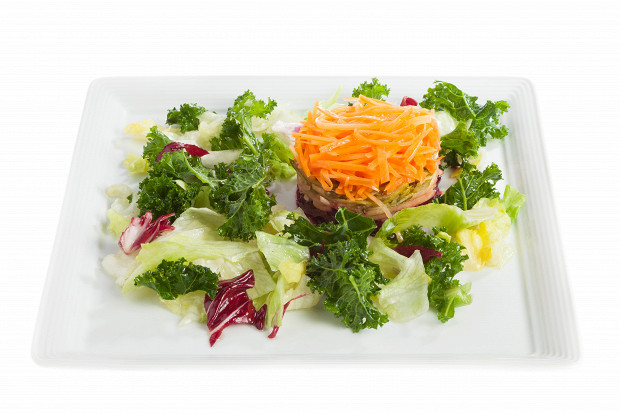 Переосмысленный винегрет с селедкой, где за соль отвечают анчоусы, а овощи упорядочены почти как в селедке под шубой.