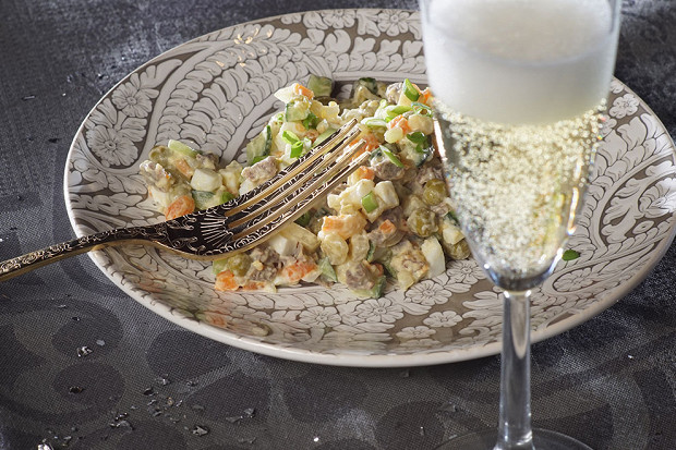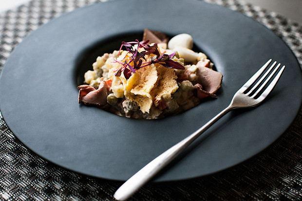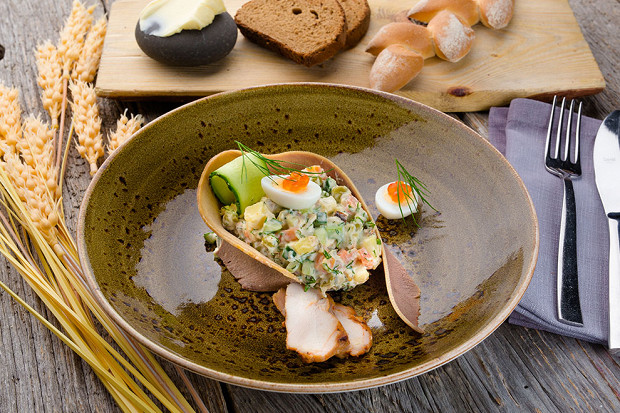 Салат шеф-повара московского ресторана «Шинок» Елены Никифоровой — оливье в южнорусском и украинском духе. Соленые огурцы — домашние, не просто картошка, а запеченная с луком, в заправке не только домашний майонез, но и сметана. Яйца используются перепелиные, а из мясной начинки — язык и запеченная курица.