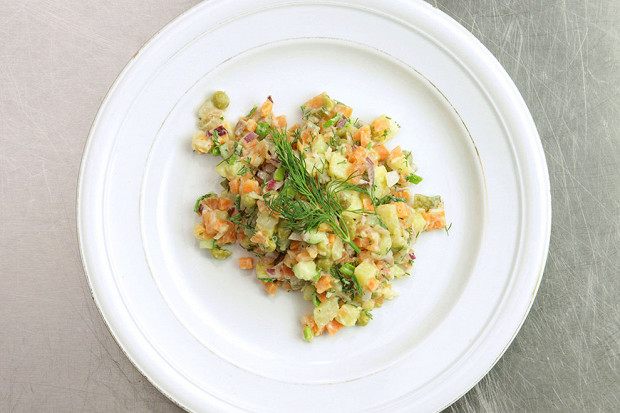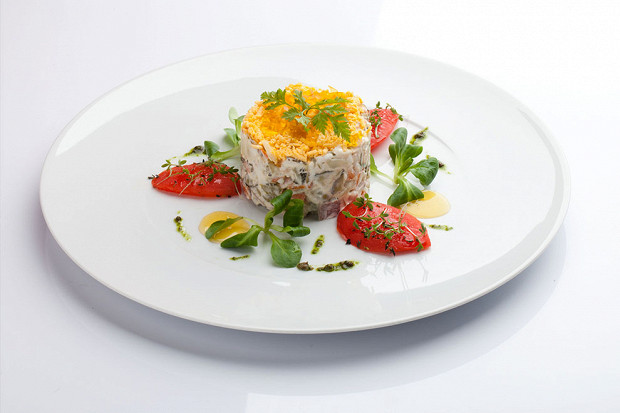 Более замысловатая версия рыбного оливье — шеф-повара московского ресторана «32.05» Владислава Рыбкина. Семга — копченая, крабы — отголосок раковых шеек «того самого оливье», а икра — чтобы жизнь удалась.