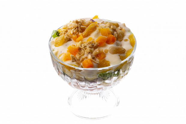 Витаминная бомба, содержащая огромное количество витаминов и полезных веществ. За отличное настроение здесь отвечают бананы, орехи и апельсины. Рецепт хорош тем, что вы можете варьировать его состав, исходя из возможностей вашего холодильника. Например, фруктовый йогурт можно заменить греческим или любым другим, орехи могут быть не только грецкими, а если у вас нет спелых слив, можно обойтись без них или добавить в салат что-то другое. Например, сезонную клубнику, которая снова начала появляться на прилавках с доступными ценником.