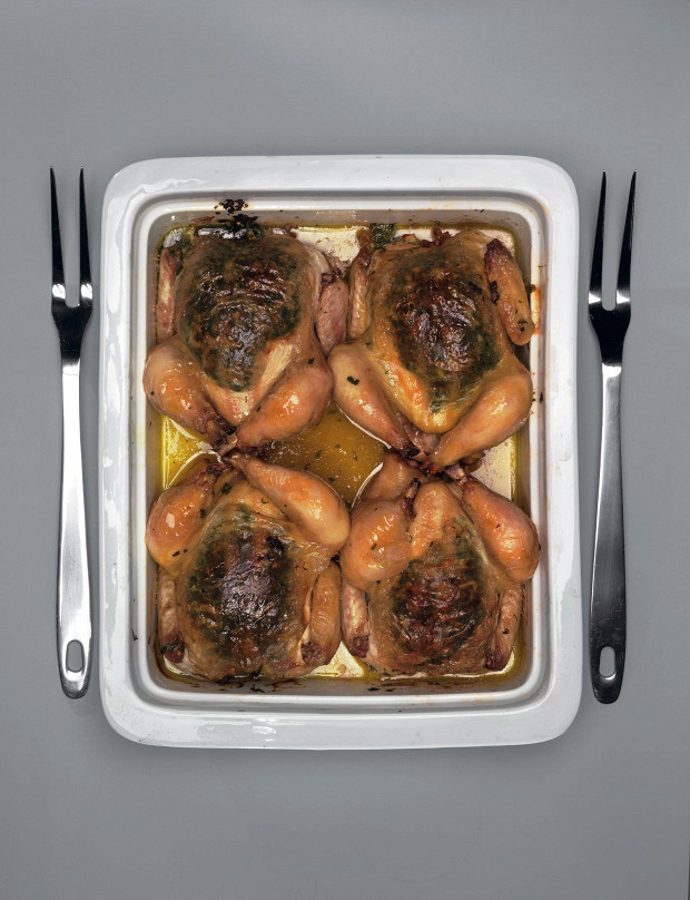 Нарядный рецепт, в котором цыплята запекаются с упрятанными под кожей 50 граммами сливочного масла (на каждого), перемешанного с большим количеством петрушки.