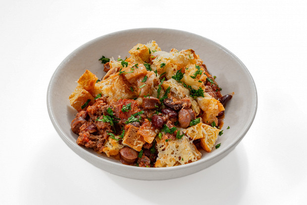 Кассуле — это величайшее французское изобретение, являющее собой густой замес из фасоли и всевозможных видов мяса, вплоть до кусочков утки конфи. В этом рецепте есть еще и сухарики, которые придают блюду сельский флер и сытность.