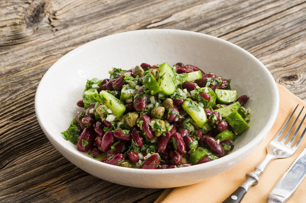 Огурцы, охапка зелени, банка фасоли и бодрящий соус — свежий и простой салат, который отлично подойдет к мясу.