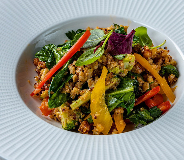 Гламурный салат сочинский шеф Алексей Павлов собрал из бобовых и круп. В нем встречаются все любимчики поваров и диетологов: консервированный нут будет мягко обволакивать рецепторы, перловка давать ореховый привкус, а бусины киноа — задорно лопаться на языке. Все это заправляется многоступенчатой душистой заправкой с участием кокосового молока, соевого соуса, кинзы и соуса кимчи. Остальное элементарно, овощи вообще можно брать любые, все равно скучным этот салат точно никто не назовет. А многие будут даже не против поменять на него кусок бифштекса.