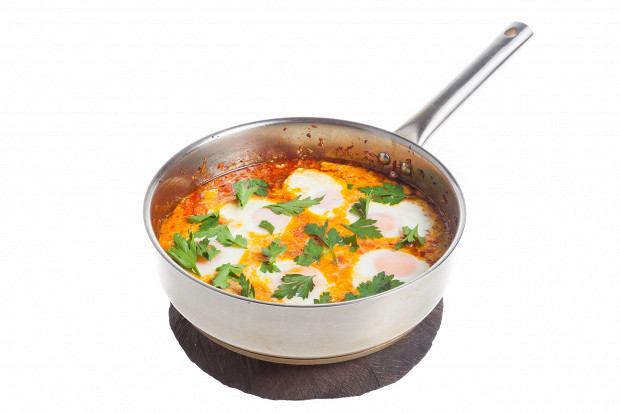Знаменитая израильская яичница, которая вышла из категории завтраков и давно уже является полноценной сытной едой. Помидоры тут должны быть сладкими — они сильно сказываются на вкусе всего блюда в целом.