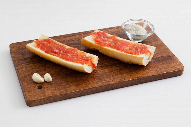 - Подсохший хлеб полить оливковым маслом, натереть чесноком, выложить на него тертый помидор и посолить.