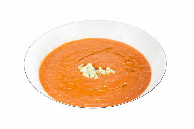 - Бросить в блендер подготовленные овощи, чеснок, отжатый от воды хлеб, добавить уксус, оливковое масло и соль. Пробить до однородной массы. Подавать охлажденным, украсив кубиками огурца и каплями оливкового масла.