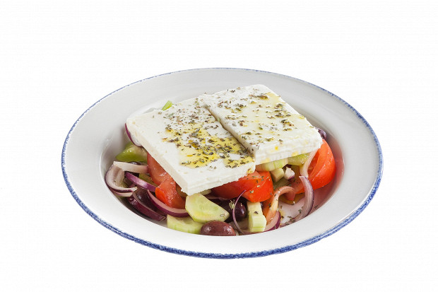 Классический греческий салат, который сами греки называют деревенским. Огурцы у них принято избавлять от шкурки, а с фетой можно обращаться как угодно: хотите — кладите куском, хотите — мелко крошите.