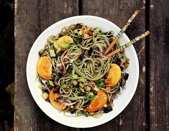 Богатый на оттенки вкусов фьюжн: лапша, жареные баклажаны, маринад из рисового уксуса, красный лук — и хурма.