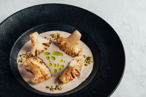 Цветная капуста давно стала чем-то вроде бюджетного заменителя мяса: у нее есть плоть, сливочность, белковая составляющая и вообще она похожа на курицу. Да и жевать, признаемся честно, упругие соцветия, поджаренные до румяной корочки, приятнее, чем соевую имитацию мясных котлет. Сергей Навасартов как раз и использует сходство капусты с птицей, дополняя ее соусом сациви. А для объемности вкуса добавляет еще и ближневосточную смесь специй хариссу, но если ее на вашей кухне не обнаружилось, берите аджику, она тоже успешно добавит капусте интересную острую нотку.