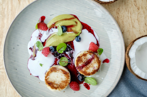 Кокосовые сырники с кремом из авокадо и чатни из сезонных ягод