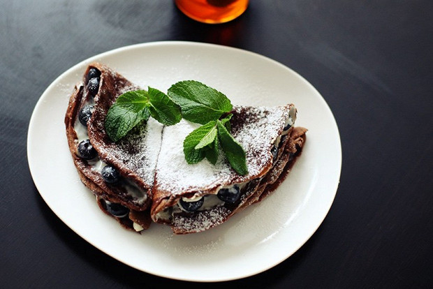 Готовить из одной только черемуховой муки нельзя, ее лишь добавляют в пшеничную, в пропорции один к двум. Готовые блины подаются с маскарпоне, голубикой и мятой. Но у черемуховой муки такой сильный вкус, что есть такие блины интересно и без начинки.